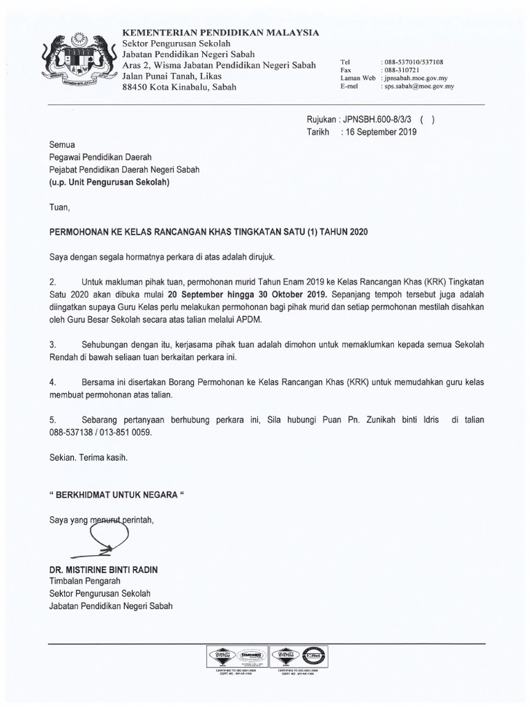 Permohonan Ke Kelas Rancangan Khas Tingkatan 1 Tahun 2020